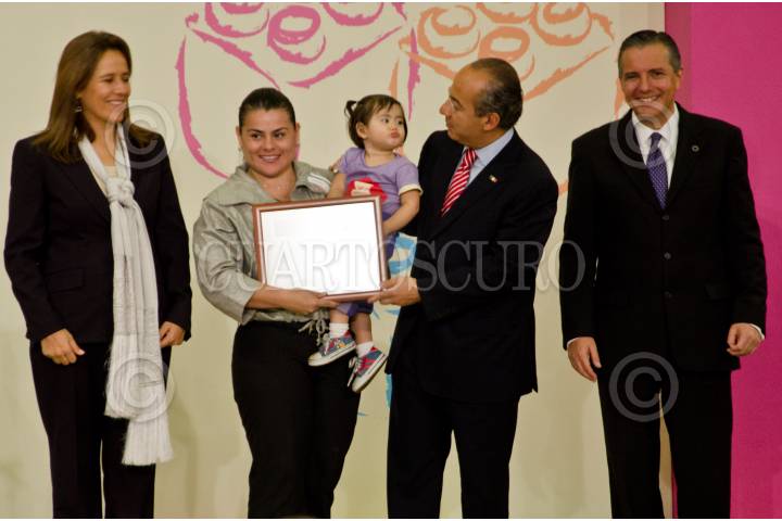 MÉXICO, D.F., 25JULIO2011.- Margarita Zavala, presidenta del DIF-Nacional; Yessika Tovar Díaz (madre beneficiada); Felipe Calderón Hinojosa, presidente de México y Heriberto Félix Guerra, secretario de Desarrollo Social durante la entrega del reconocimiento "800 mil niños beneficiados" en las estancias infantiles. Ésto se realizó en la residencia oficial de Los Pinos. FOTO: MISAEL VALTIERRA/CUARTOSCURO.COM