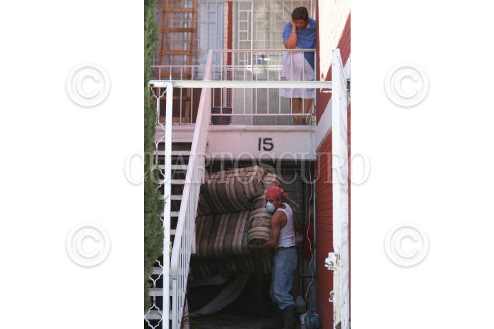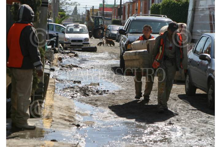 NEZAHUACÓYOTL, ESTADO DE MÉXICO, 08FEBERO2010.- Trabajadores ayudan a damnificados de las colonias afectadas por el desbordamiento del Río de los Remedios, a sacar y tirar a la basura muebles dañados. FOTO: GUADALUPE CARRILLO/CUARTOSCURO.COM