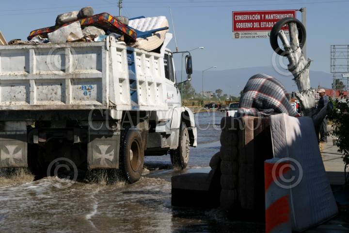 NEZAHUACÓYOTL, ESTADO DE MÉXICO, 08FEBERO2010.- Camiones de carga llevan con destino a basureros muebles echados a perder a causa del desbordamiento del Río de los Remedios. FOTO: GUADALUPE CARRILLO/CUARTOSCURO.COM