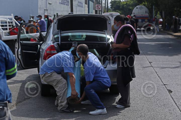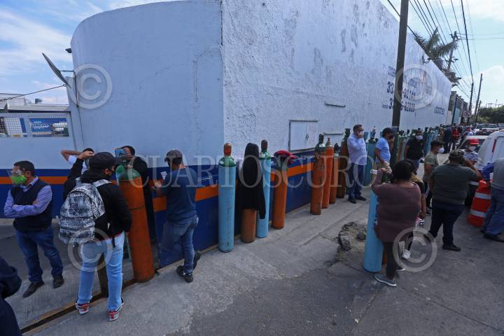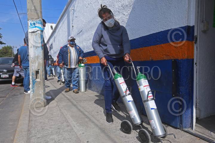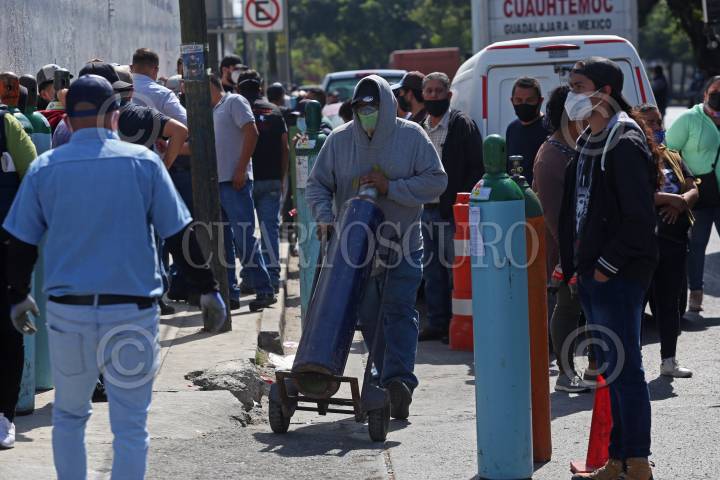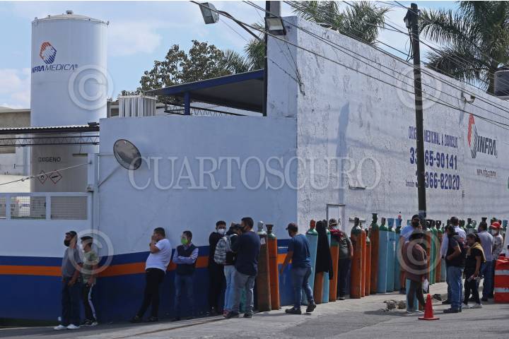 Decenas de personas hacen largas filas a las afueras de un centro de distribución para rellenar sus tanques de oxigeno, esto ante el incremento de personas contagias por Covid-19 en Guadalajara.