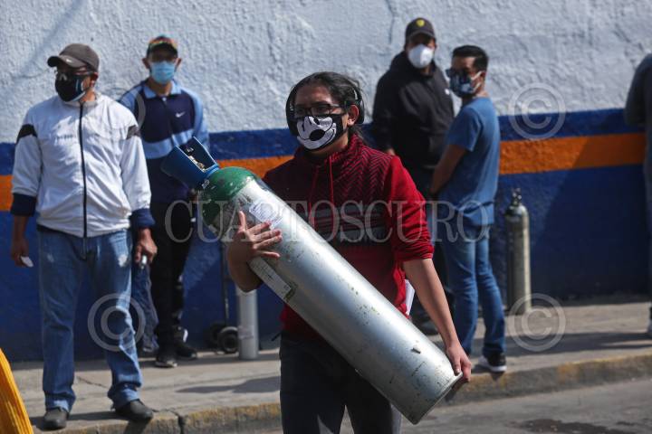 Un hombre carga un tanque rellenado de oxigeno, esto en un centro de distribución donde un gran numero de personas hacen largas filas.