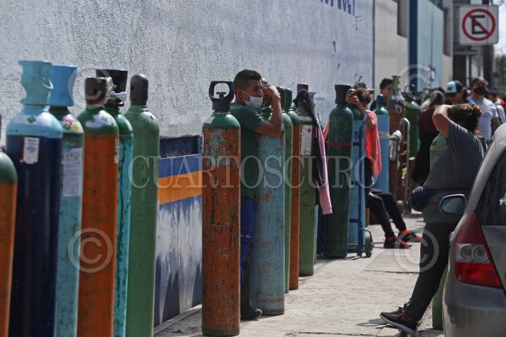 Un hombre transporta en un diablito un tanque para rellenar de oxigeno, esto en un centro de distribución donde un gran numero de personas hacen largas filas.
