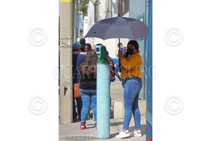 Una mujer que hace fila a las afueras de un centro de distribución para rellenar su tanque de oxigeno, se cubre del intenso sol con una sombrilla.