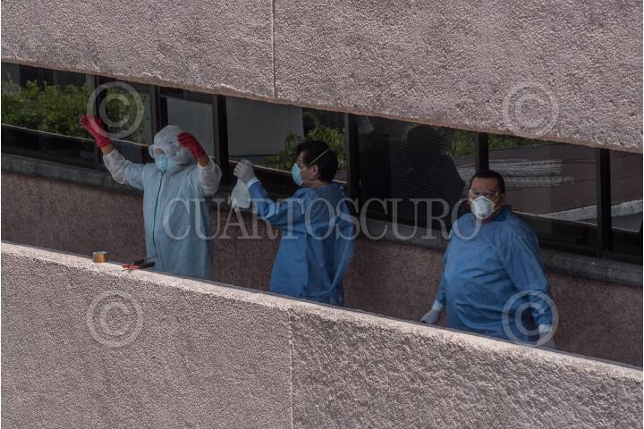 Personal médico del Hospital de Infectología La Raza realiza proceso de sanitización después de retirar material biológico-infeccioso.