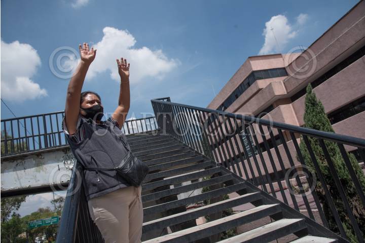 Una mujer con ayuda de binoculares observa desde el puente peatonal de Circuito Interior poder ver a su enfermo. Dicho sitio se ha vuelto una zona en donde los familiares buscan esperanza al ver a sus pacientes internados.