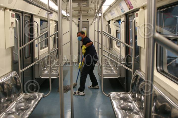 MÉXICO, D.F., 05MAYO2009.- Trabajadores de limpieza del Metro limpian los vagones para evitar focos de infección por el virus de la influenza. FOTO: RICARDO CASTELAN/CUARTOSCURO.COM