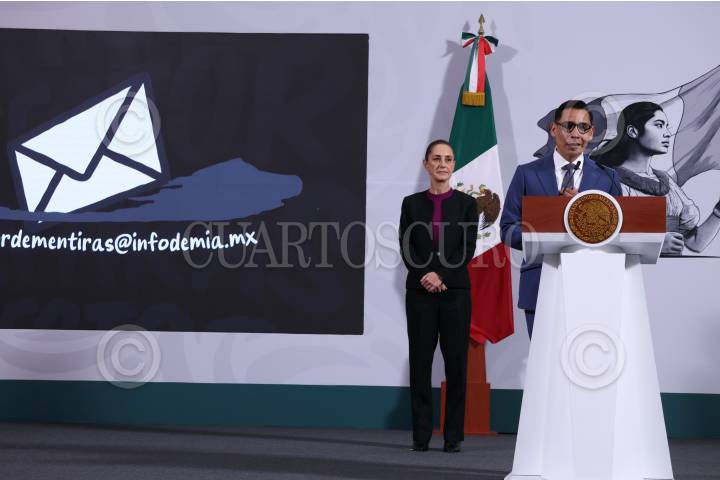 CIUDAD DE MÉXICO, 09JULIO2025.- Miguel Elorza Vásquez, coordinador de Infodemia, durante su participación en la Conferencia del pueblo, encabezada por Claudia Sheinbaum, presidenta de México, realizada en Palacio Nacional. FOTO: GRACIELA LÓPEZ/CUARTOSCURO.COM
