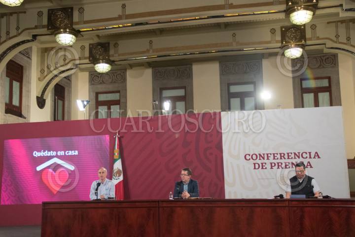 El subsecretario Hugo López-Gatell, en la conferencia de informe diario, sobre la situación que guarda el Covid 19 en México. Lo acompañaron Genaro Villamil y el médico José Luis Alomía.