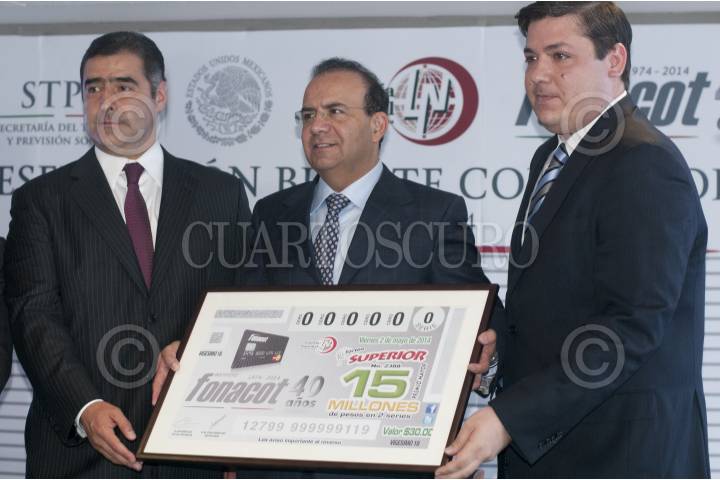 MÉXICO, D.F., 14ABRIL2014.- César Alberto Martínez Baranda, Director General del Instituto Fonacot; Alfonso Navarrete Prida, Secretario del Trabajo y Previsión Social y Humberto Zolezzi Carbajal, Gerente de Planeación Institucional y Relaciones Internacionales de la LOTENAL, encabezaron la presentación del billete de la lotería por motivo del 40 aniversario de Fonacot. FOTO: DIEGO SIMÓN SÁNCHEZ /CUARTOSCURO.COM