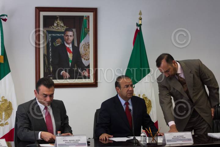 MÉXICO, D.F., 22AGOSTO2013.- César Alberto Martínez Baranda, Director General del Instituto Fonacot y Jesús Alfonso Navarrete Prida, Secretario del Trabajo y Prevensión Social, durante la firma del Plan Estratégico Infonacot 2013-2018. FOTO: ADOLFO VLADIMIR /CUARTOSCURO.COM