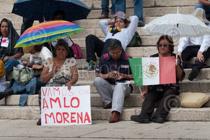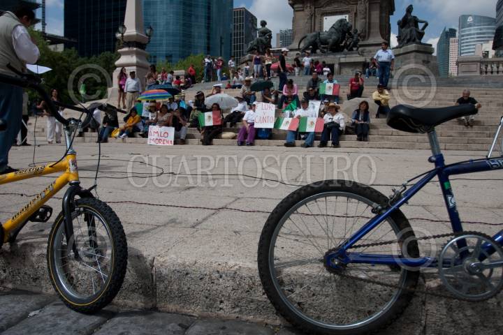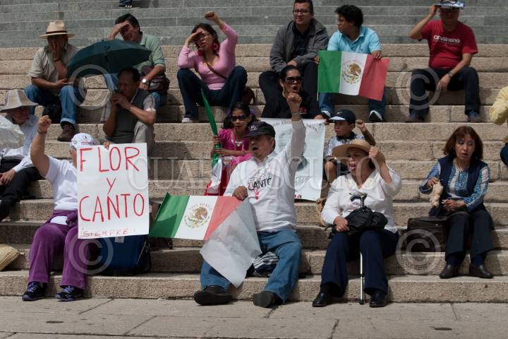 MÉXICO, D.F., 07JULIO2011.- Integrantes de la organización Flor y Canto simpatizantes del Movimiento de Regeneración Nacional (MORENA) realizaron un asamblea informativa sobre la elecciones del Estado México y rindieron una homenaje a los héroes de la independencia en las escalinatas de Ángel de la Independencia. FOTO: GUILLLERMO PEREA/CUARTOSCURO.COM