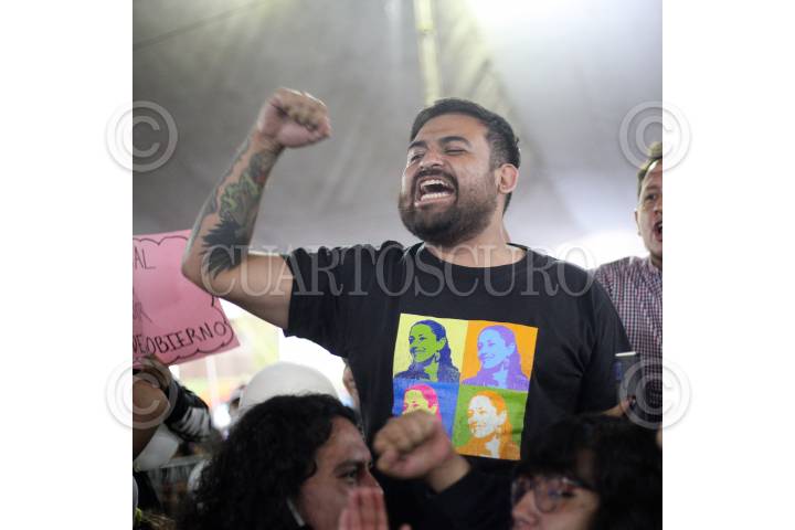 Ulises Bravo, medio hermano del gobernador de Morelos y dirigente estatal del Movimiento de Regeneración Nacional durante su discurso en la Asamblea Informativa sobre la Reforma Electoral llevada a cabo este mediodia en la plaza de armas de Cuernavaca.