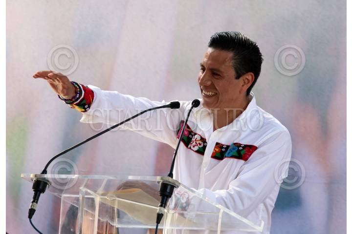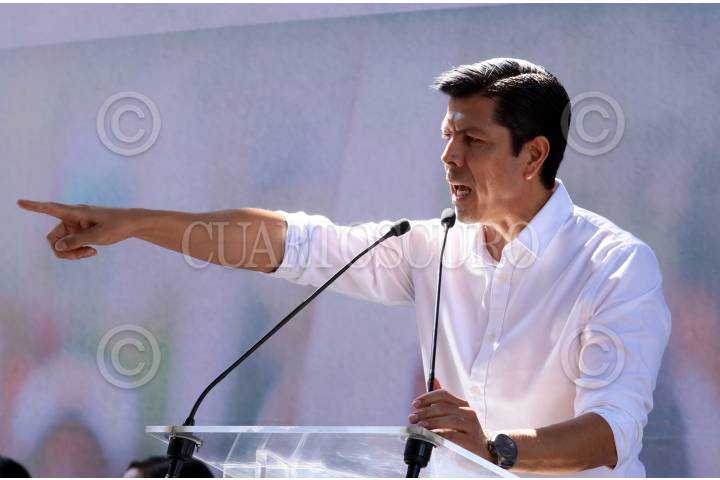 El senador Sergio Pérez Flores del Movimiento de Regeneración Nacional durante su discurso en la Asamblea Informativa sobre la Reforma Electoral llevada a cabo este mediodía en la plaza de armas de Cuernavaca.