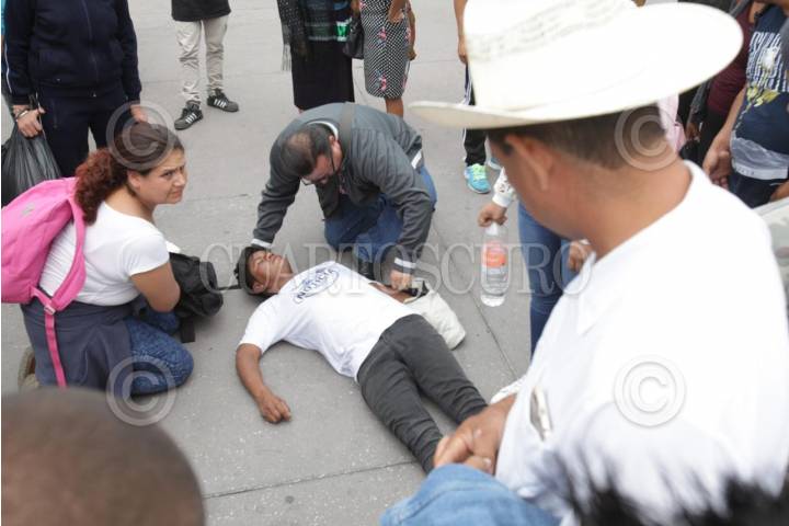 CIUDAD DE MÉXICO, 01JULIO2019.- Cientos de personas se dieron cita en la plancha del zócalo para escuchar el primer informe de actividades del Presidente de México Andrés Manuel López Obrador a un año de haber ganado las elecciones. En la imagen un joven es atendido tras desvanecerse. FOTO: ANDRÉS YAÑEZ /CUARTOSCURO.COM