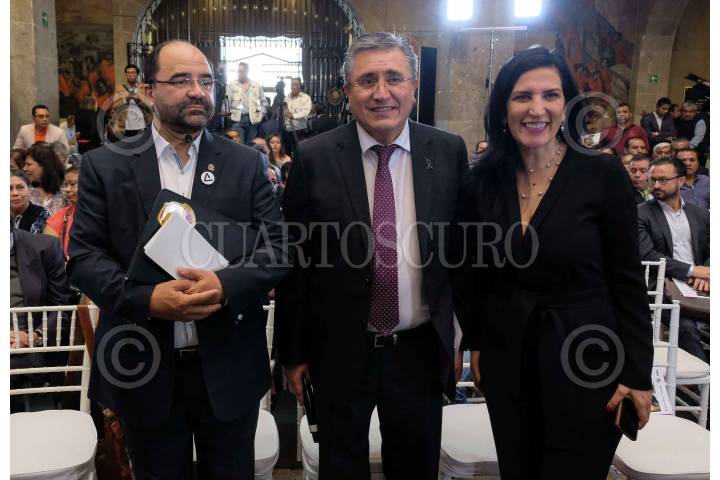 CIUDAD DE MÉXICO, 14AGOSTO2019.- Emilio Alvarez Icaza, senador independiente; Luis Raúl González Pérez, Ombudsperson Nacional, y Kenia López, senadora del PAN, durante la presentación del Primer Informe de Actividades del Senador Emilio Álvarez Icaza correspondientes al primer año de ejercicio de la LXIV Legislatura, realizado en la antigua sede del Senado de la República. FOTO: CUARTOSCURO.COM