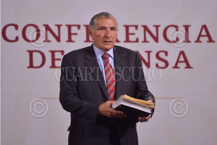 Adán Augusto López, secretario de Gobernación, durante la conferencia matutina realizada en Palacio Nacional, en la que presentó y firmó el decreto del reforzamiento de las acciones del Gobierno Federal en el Estado de Nuevo León para garantizar el abasto de agua.