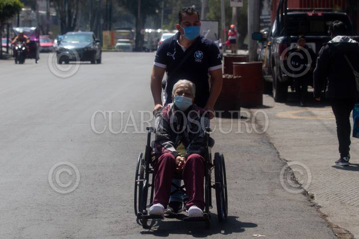 Un familiar acompaña a una señora que acaba de salir del Hospital General Tláhuac