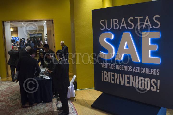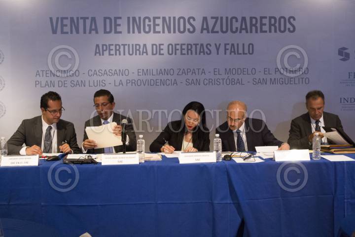 MÉXICO, D.F., 12JUNIO2015.- Inicio la subasta de nueve ingenios azucareros por parte del Servicio de Administración y Enajenación de Bienes, durante la sesión los ingenios adjudicados fueron Atencingo y San Cristóbal por mil 974 millones de pesos a la firma Impulsora Azucarera del Noroeste y el bloque conformado por Casasano y Emiliano Zapata por mil 308 millones de pesos a Grupo Beta San Miguel, uno de los mayores productores de azúcar del país. FOTO: MOISÉS PABLO /CUARTOSCURO.COM