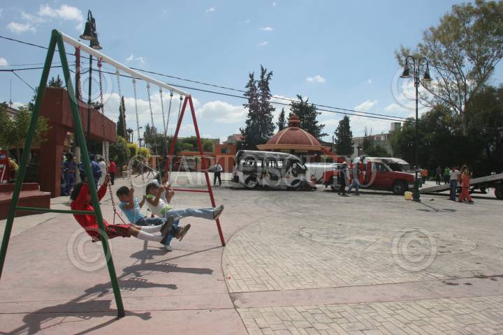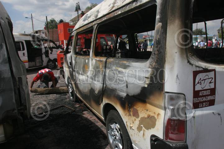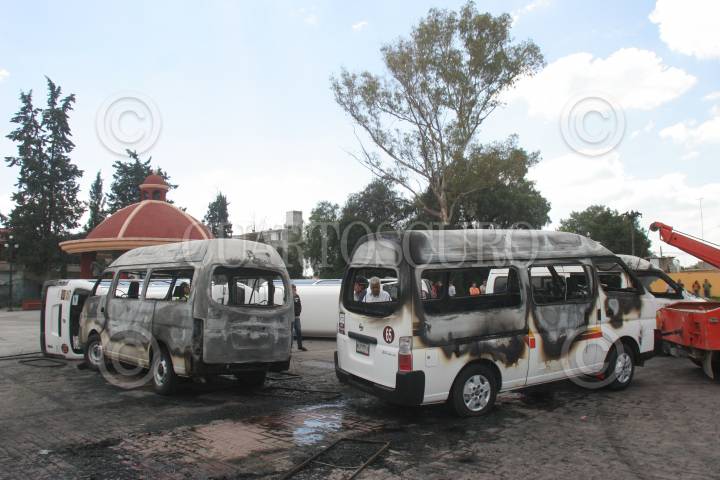 ZUMPANGO, ESTADO DE MÉXICO, 05OCTUBRE2010.- Alrededor de 200 pobladores del Barrio de San Pedro de la Laguna, incendiaron tres unidades de transporte público y volcaron 2 de la línea Teoloyucan-Zumpango, después de que ayer fuera atropellada una menor de edad por una de las camionetas y perdiera la vida. FOTO: SAÚL LÓPEZ/CUARTOSCURO.COM