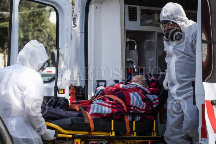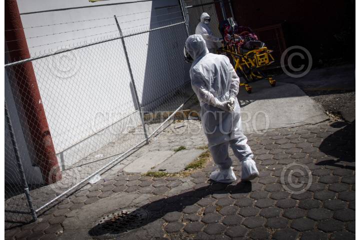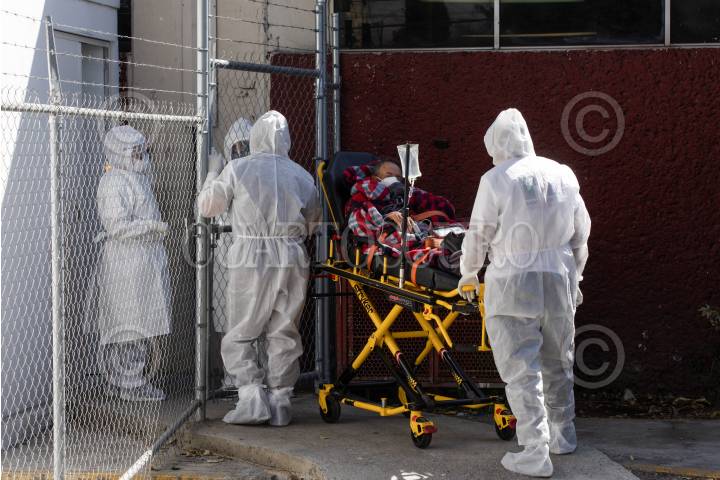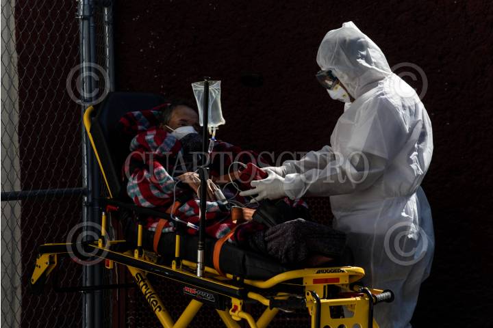 Paramédicos trasladan a un paciente con síntomas covid-19 al Triage Respiratorio del Hospital General.