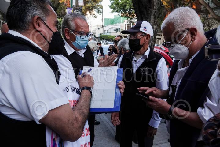 Adultos mayores pasan lista tras marchar de metro Eugenia al INAPAM para continuar su proceso ante Walmart y recuperar sus fuentes de trabajo como empacadores.