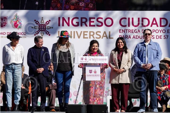 CIUDAD DE MÉXICO, 29NOVIEMBRE2024.- Gabriela Osorio Hernández, alcaldesa de Tlalpan; Giovani Gutiérrez, alcalde de Coyoacán;Nancy Marlene Núñez, alcaldesa de Azcapotzalco; Clara Brugada Molina, jefa de gobierno de la Ciudad de México; Lourdes Paz Reyes, alcaldesa de Iztacalco, y Luis Mendoza Acevedo, alcalde de Benito Juárez, encabezaron la entrega de los apoyos “Ingreso Ciudadano Universal” para población de 57 a 59 años. FOTO: GALO CAÑAS/CUARTOSCURO.COM