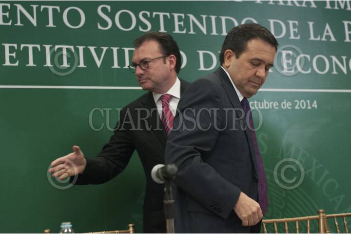 MÉXICO, D.F., 02OCTUBRE2014.- Ildefonso Guajardo Villarreal, secretario de Economía; Luis Videgaray, secretario de Hacienda y Crédito Público, encabezaron la conferencia de prensa para anunciar la Iniciativa de Ley para impulsar el incremento sostenido de la Productividad y la competitividad de la economía nacional que propuso el presidente Enrique Peña Nieto. FOTO: DIEGO SIMÓN SÁNCHEZ /CUARTOSCURO.COM