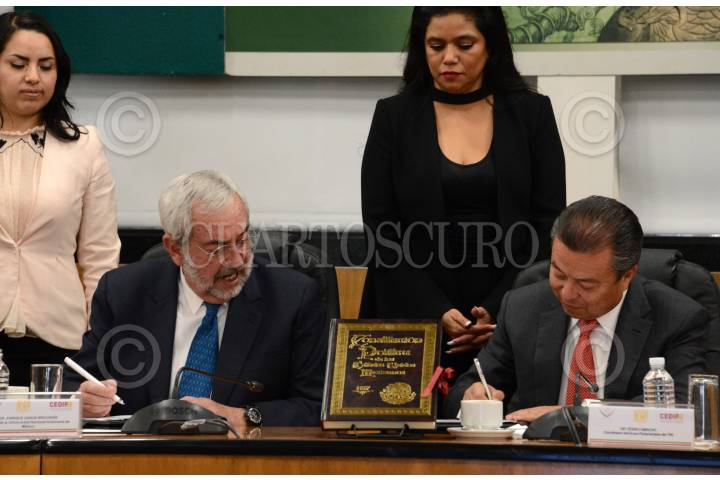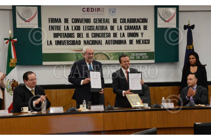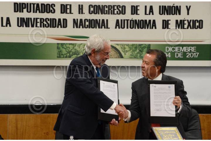 CIUDAD DE MÉXICO, 04DICIEMBRE2017.- Enrique Graue, rector de la Universidad Nacional Autónoma de México (UNAM), realizó la firma del convenio con la Cámara de Diputados del H. Congreso de la Unión, para profesionalizar a legisladores y servidores públicos, además de abrir un proceso de orientación y asesoría permanentes para la elaboración de iniciativas de ley. FOTO: UNAM /CUARTOSCURO.COM