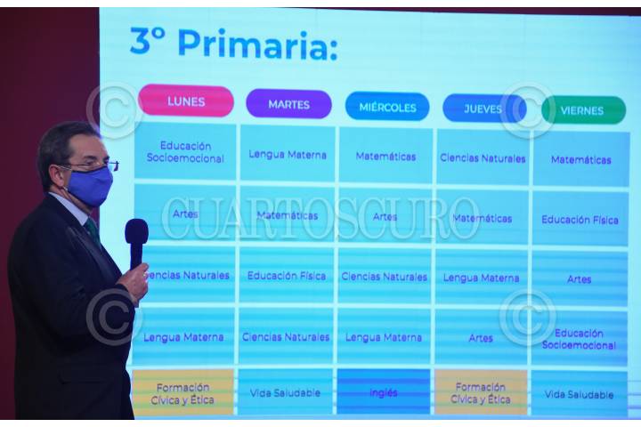 Esteban Moctezuma, titular de la SEP, exponiendo las materias que cursarán los alumnos de tercer grado de primaria.