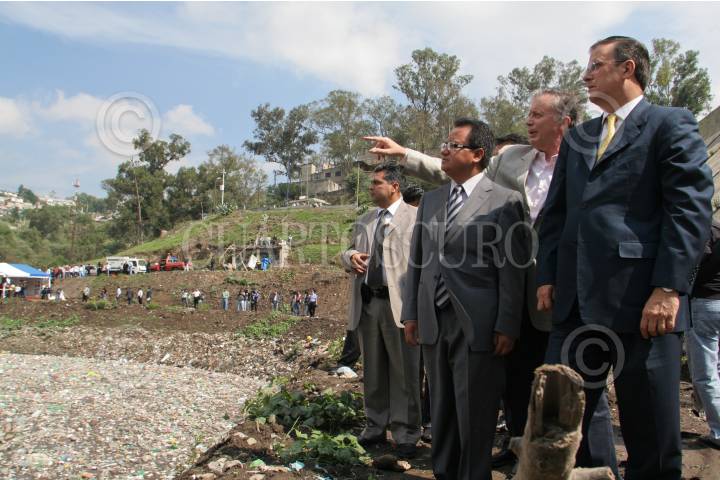 MÉXICO, D.F., 24JUNIO2010.- Eduardo Santillán, Delegado de Alvaro Obregon, junto a Ramón Aguirre, director del Sistema de Aguas de la Ciudad de México y Marcelo Ebrard Casaubon, Jefe de Gobierno Capitalino, realizaron un recorrido por la Presa Tacubaya donde se empezaran a realizar trabajos de remoción de escombros de basura para que en la temporada de lluvias se reduzca el riesgo de inundaciones. FOTO: ENRIQUE ORDÓÑEZ/CUARTOSCURO.COM