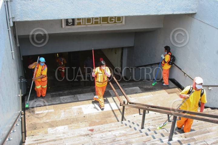MÉXICO, D.F., 04MAYO2009.- Brigadas de limpieza del Distrito Federal limpian y desinfectan las entradas del Metro, esto como una medida más para evitar el contagio por el virus de la influenza humana. FOTO: RICARDO CASTELAN/CUARTOSCURO.COM