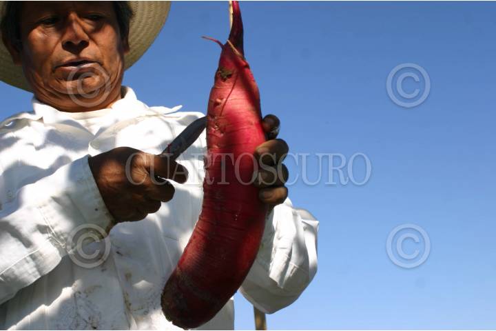 OAXACA, OAXACA 21DICIEMBRE2008.- La Noche de Rábanos es una fiesta de sello netamente popular en la que los hortelanos y floricultores exhiben sus diseños especiales realizados con el rábano, la flor inmortal y el totomoxtle. Dura sólo unas horas, pero congrega prácticamente a todos los habitantes de la ciudad en el área del zócalo, quienes concurren con el objeto de admirar la creatividad de los participantes en este concurso anual que se realiza el 23 de diciembre. Este fin de semana cientos de Hortelanos cosechan sus rábanos en los campos circunvecinos del Tequio, a este concurso anual que año con año atrae a cientos de turistas FOTO: MAX NÚÑEZ/CUARTOSCURO.COM