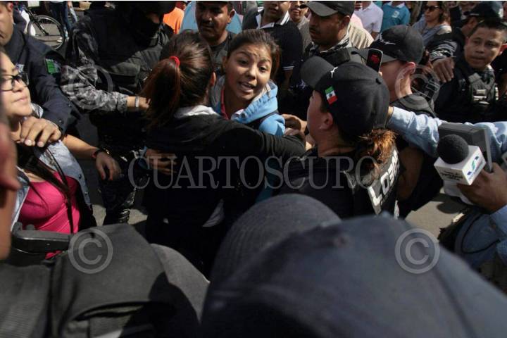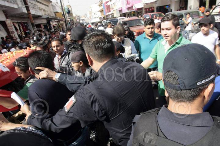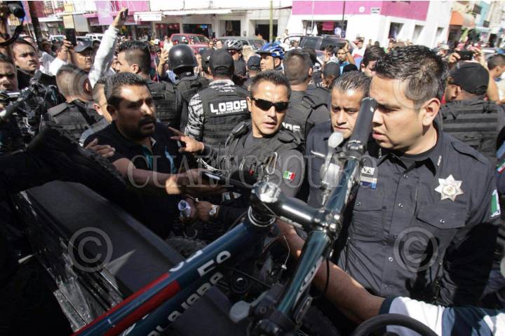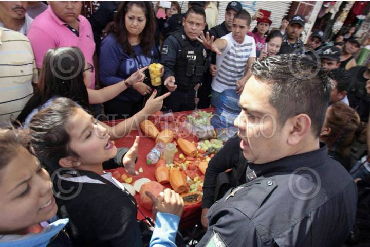 GUADALAJARA, JALISCO,. 17DICIEMBRE2015.- Personal del Ayuntamiento municipal entre inspectores y policías desplegaron un operativo para impedir que un grupo de comerciantes de la zona de Obregón se instalaran en los espacios públicos en donde solían instalarse comúnmente lo que ocasiono un pequeño choque entre ambas partes. FOTO : CUARTOSCURO.COM