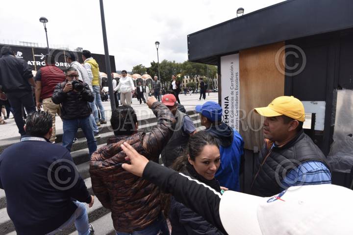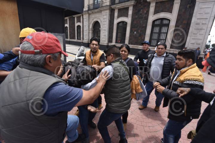 TOLUCA, ESTADO DE MÉXICO, 01JULIO2019.- Inspectores de comercio del Ayuntamiento de Toluca agredieron a dos fotógrafos mientras documentaban las agresiones contra gente que se encontraba en el Teatro Morelos y el decomiso de un carro de papas, les intentaron quitar su equipo de trabajo y los golpearon en cuerpo y cara. FOTO: CRISANTA ESPINOSA AGUILAR /CUARTOSCURO.COM
