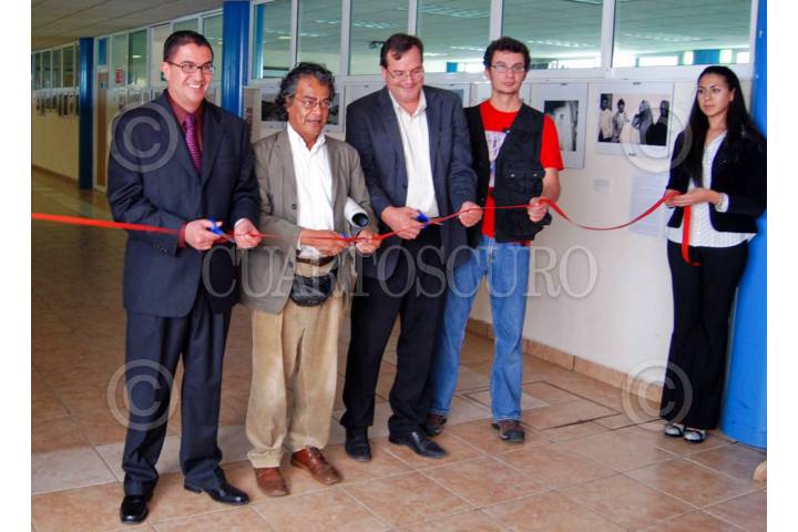 FRESNILLO, ZACATECAS, 22SEPTIEMBRE2009.- José Guadalupe Estrada Rodriguez, rector de la Universidad Politécnica de Zacatecas en compañía de Pedro Valtierra, Fotógrafo y Director de la Fototeca de Zacatecas, Juan Manuel Alvarez Haro, vicerector de la Universidad y Sergio Mayorga Magallanes durante el corte de listón de la exposición fotografica -Tiempo, Memoria y Plata- que se llevo acabo en dicha institución. FOTO: CARLOS SEGURA/CUARTOSCURO.COM