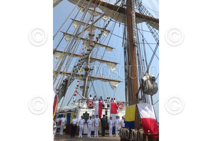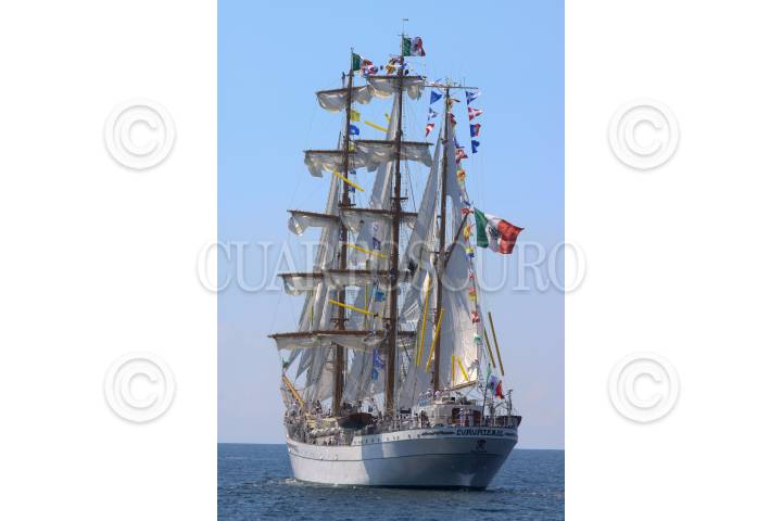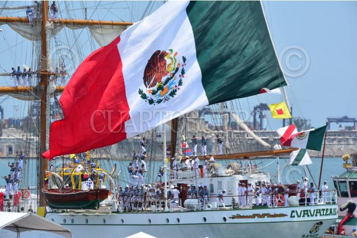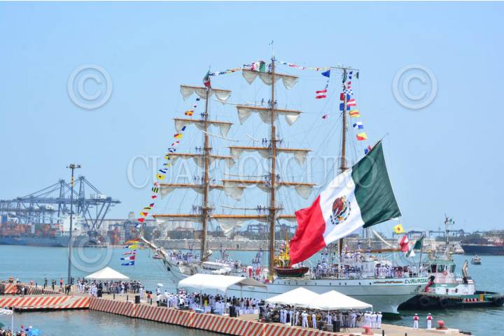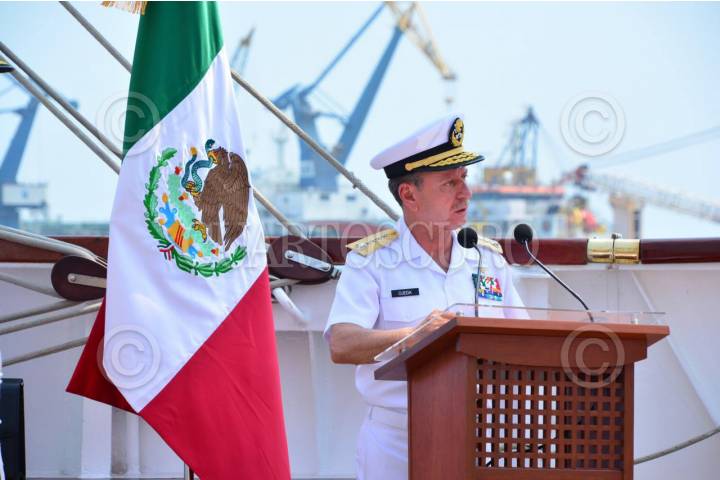 VERACRUZ, VERACRUZ, 16ABRIL2019.- Esta mañana 259 tripulantes, entre ellos 24 mujeres, zarparon del muelle Turístico del puerto de Veracruz, en el Buque Escuela ARM “Cuauhtémoc” (BE-01) para dar inicio al crucero de instrucción Europa del Norte 2019, donde navegarán 226 días y visitarán 15 puertos de 11 países del mundo con la misión de estrechar los lazos de amistad del pueblo mexicano con otras naciones, así como llevar un mensaje de paz y buena voluntad en los puertos y mares del mundo, además de ceñir relaciones académicas y culturales entre Fuerzas Armadas. La ceremonia de zarpe se realizó a bordo del Buque Escuela ARM, ahí el Almirante José Rafael Ojeda Durán, Secretario de Marina y Alto Mando de la Armada de México estuvo a acompañado del General Luis Crescencio Sandoval González, Secretario de la Defensa Nacional; así como de autoridades civiles, militares y navales. FOTO: SEMAR /CUARTOSCURO.COM