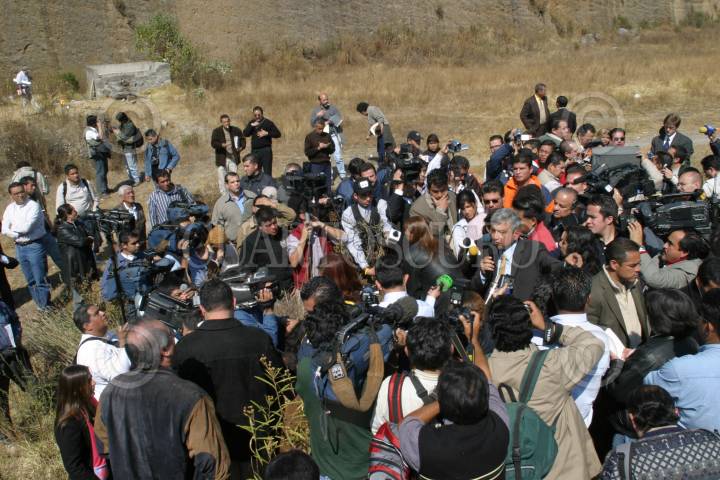 MEXICO, D.F. 17ENERO2005.- Reporteros de la fuente hacen malabares durante el recorrido que Andrés Manuel López Obrador, jefe de gobierno de la ciudad de México por el predio el "Encino". FOTO: Nelly Salas/CUARTOSCURO.COM