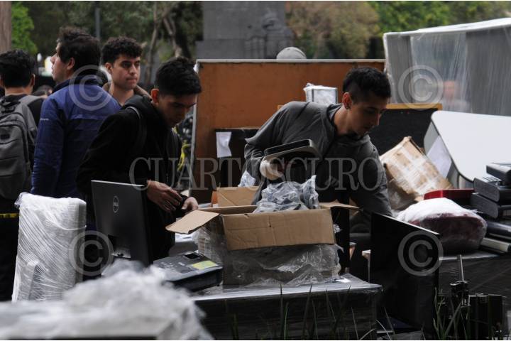CIUDAD DE MÉXICO, 11JULIO2024. - Los alumnos de la escuela Fermatta revisan los materiales que fueron dejados en la calle tras el desalojo. FOTO: DANIEL AUGUSTO /CUARTOSCURO.COM
