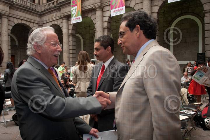 MÉXICO, D.F. 22MAYO2012.-El empresario Alberto Nuñez Esteva saluda al analista político Sergio Aguayo, durante la "Primera Cumbre Ciudadana para la Construcción de un México Pacífico y Justo" en el Palacio de Minería, donde diversas organizaciones ciudadanas presentaron a los cuatro candidatos presidenciales sus propuestas en materia de Seguridad y Derechos Humanos. FOTO: JUAN PABLO ZAMORA /CUARTOSCURO.COM