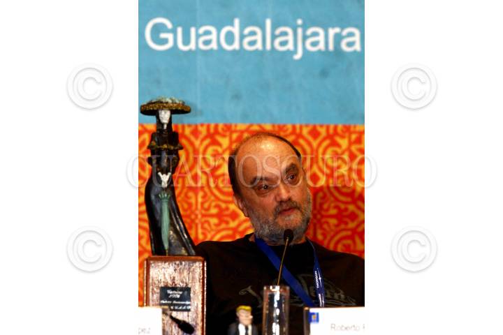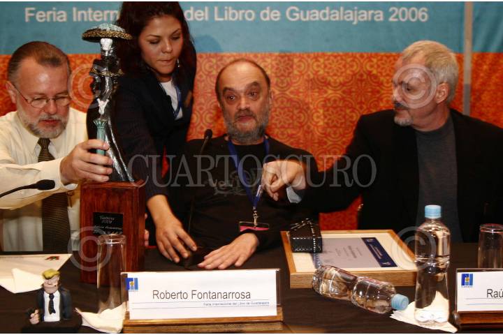 GUADALAJARA JALISCO 02DICIEMBRE2006.- El caricaturista Roberto Fontanarrosa quien primero deleito a un publico habido de sus ocurrencias para después recibir de manos de el Rector de la Universidad de Guadalajara "La Catrina" reconocimiento que otorga año con año la Fil a los móneros. FOTO: JOSÉ MARÍA MARTÍNEZ/CUARTSOCURO.COM