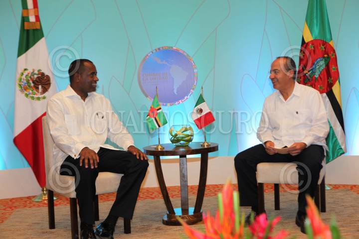 PLAYA DEL CARMEN, QUINTANA ROO, 21FEBRERO2010.- Roosevelt Skerrit, Primer ministro de Dominicana, conversa con Felipe Calderón, Presidente de México durante la Primera Cumbre de México-CARICOM que se llevo a cabo en un hotel de la zona. FOTO: ARIEL GUTIERREZ/CUARTOSCURO.COM