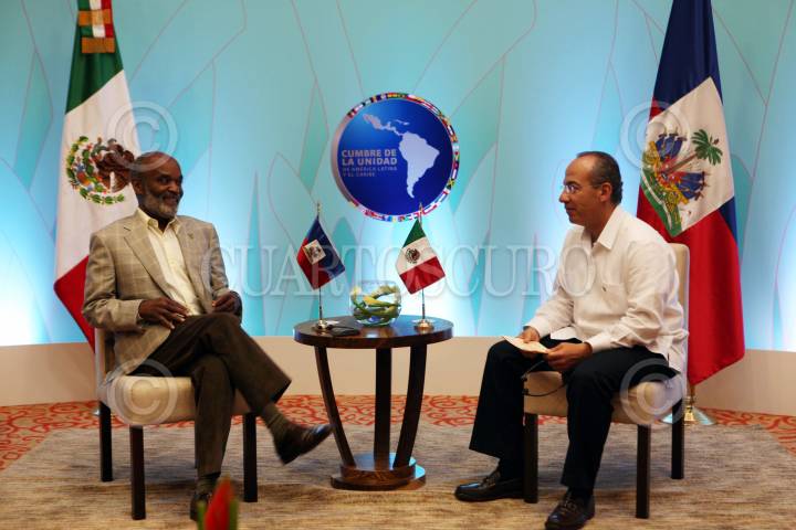 PLAYA DEL CARMEN, QUINTANA ROO, 21FEBRERO2010.- Rene Preval, Presidente de laRepublica de Haiti, conversa con Felipe Calderón, Presidente de México durante la Primera Cumbre de México-CARICOM que se llevo a cabo en un hotel de la zona. FOTO: ARIEL GUTIERREZ/CUARTOSCURO.COM
