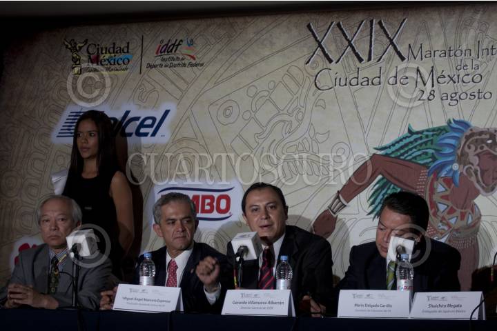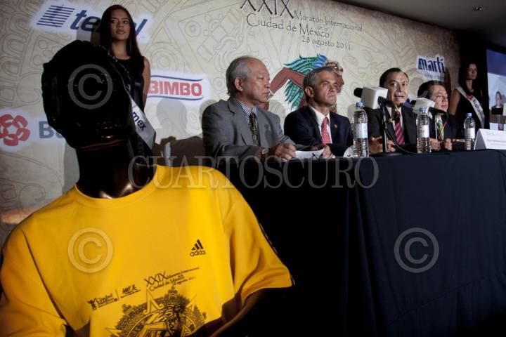 MÉXICO D.F., 25JULIO2011.- Eisi Goshozono, Director Administrativo de la Cámara Japonesa de Comercio e Industria en México, Miguel Ángel Mancera Espinosa, Procurador de Justicia del D.F., Gerardo Villanueva Albarrán, Director General del IDDF y Mario Delgado, Secretario de Educación del Distrito Federal, dieron a conocer los detalles de la realización del XXIX Maratón Internacional de la Ciudad de México que se realizara el próximo 28 de Agosto en esta ciudad. FOTO: GUILLERMO PEREA/CUARTOSCURO.COM