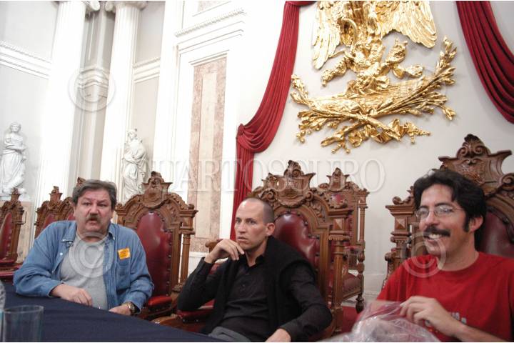 MÉXICO D.F. 25FEBRERO2007.- Los escritores, Paco Ignacio Taibo II, acompañado de Pedro Ángel Paulo y Pedro Salmerón, durante la presentación de sus respectivos libros "Pancho Villa" "Zapata" "Divisió del Norte" respetivamente, esto dentro de las actividades de la fería intenacional del libro en el Palacío de Minería de la UNAM. FOTO: GUILLERMO PEREA/CUARTOSCURO.COM CUARTOSCURO.COM