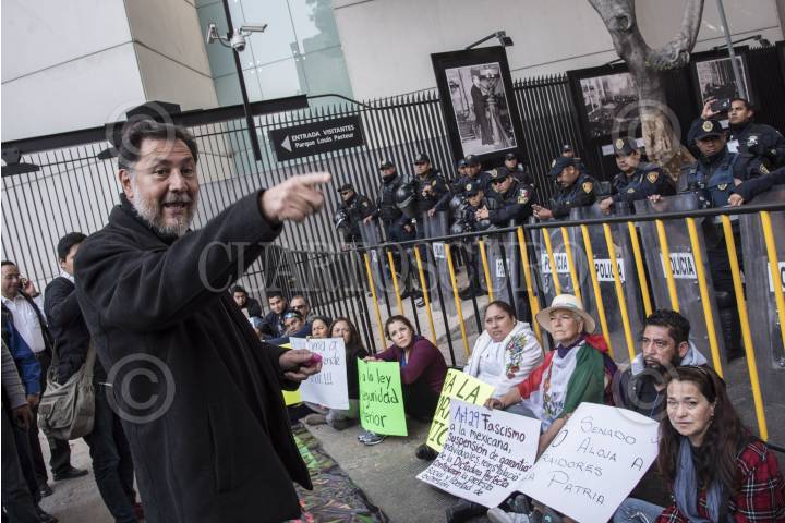 CIUDAD DE MÉXICO, 07FEBRERO2017.- Alrededor de 40 personas acudieron al llamado de Gerardo Fernández Noroña, ex miembro del Partido de la Revolución Democrática, para bloquear el acceso al Senado de la República con el propósito de evitar que los senadores legislen sobre la nueva Ley de Seguridad Interior, la cual normaliza la intervención de las fuerzas militares en las calles y da pie a la intervención de medios de comunicación con el fin de recolectar datos de la ciudadanía en caso de considerarse necesario. FOTO: TERCERO DÍAZ /CUARTOSCURO.COM