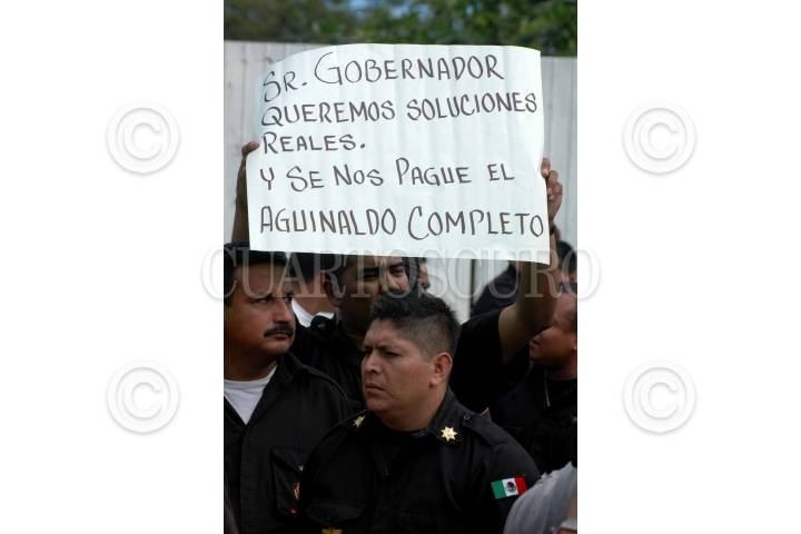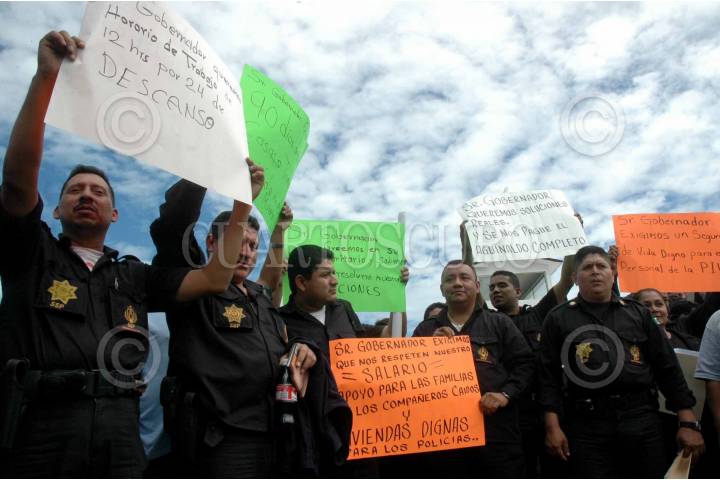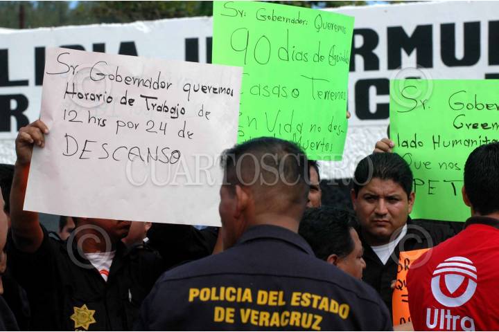 VERACRUZ, VER. 24OCTUBRE2007.- Medio centenar de elementos de la policía intermunicipal Veracruz-Boca del RÌo se manifestaron esta mañana en demanda a la solución de un pliego petitorio que hicieran llegar al gobernador del estado Fidel Herrera, pidiendo entre otras cosas aumento de sueldo, pago completo de aguinaldo, horarios de trabajo por ocho horas, uniformes y armamento. FOTO: JOSÉ CANDELARIO/CUARTOSCURO.COM