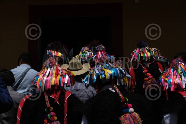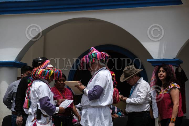 Las autoridades tradicionales entran después de los funcionarios públicos federales, estatales y municipales a la casa del presidente municipal para disfrutar de una comida tradicional de la región.