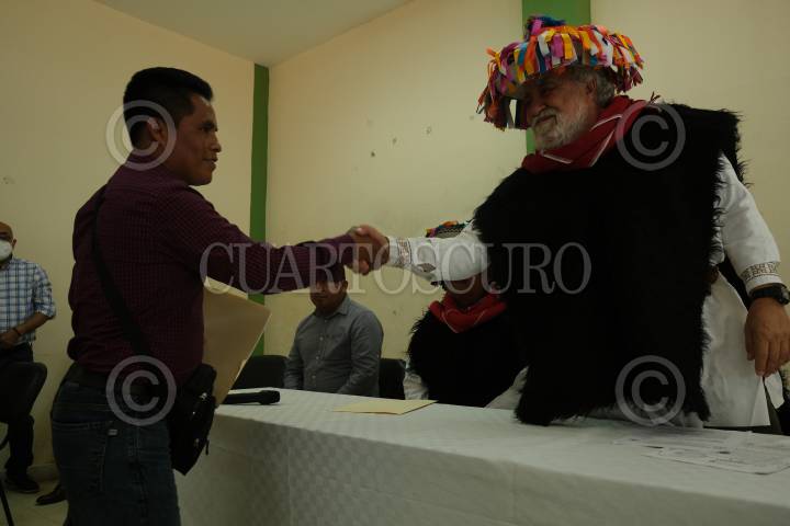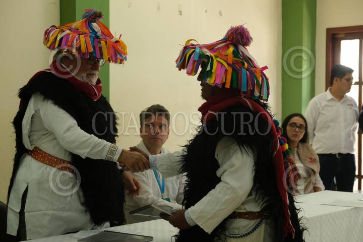 Alejandro Encinas, Subsecretario de Derechos humanos, población y migración, da la mano a uno de los representantes de las autoridades tradicionales de Santa Martha.