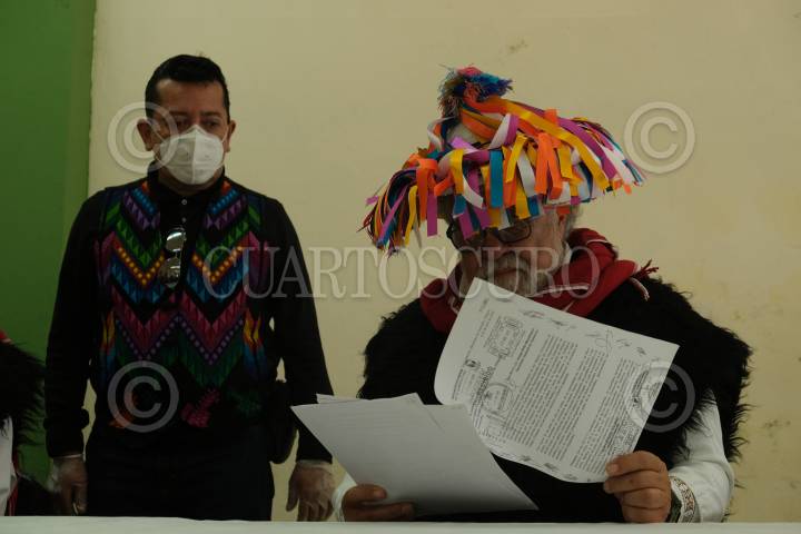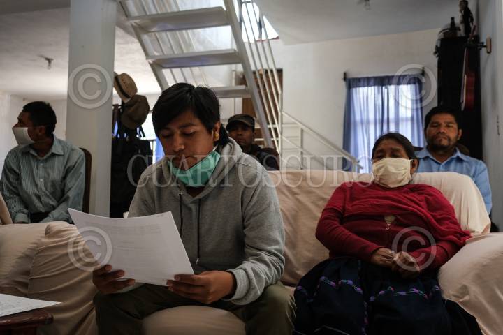 Uno de los lideres de los 115 comuneros lee un documento dirigido a la población y a los tres ordenes de gobierno, detallando el conflicto agrario entre Aldama y Chenalhó. Mencionaron que seguirán defendiendo su tierra como legítimos dueños y que a pesar de las firmas de los pactos de no agresión, ellos, en sus comunidades continúan recibiendo disparos.