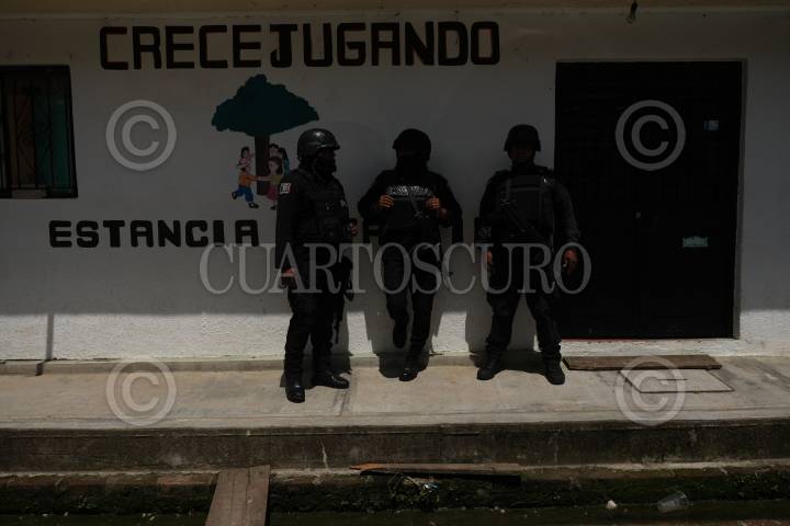 Policías estatales resguardan el área donde se encuentran los funcionarios públicos.
